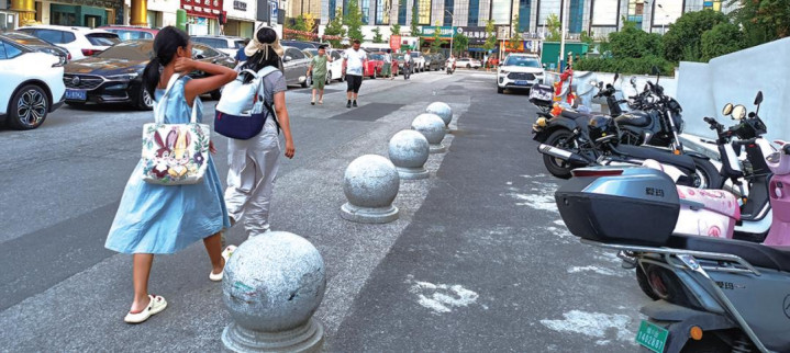 14日,记者根据市民反映来到芝罘区经伦街,看到在街西侧一字排开摆放着5个球形隔离墩,距离路边有4米多宽,导致该路段骤然“变窄”,车辆和行人通行此处时,存在交通安全隐患。